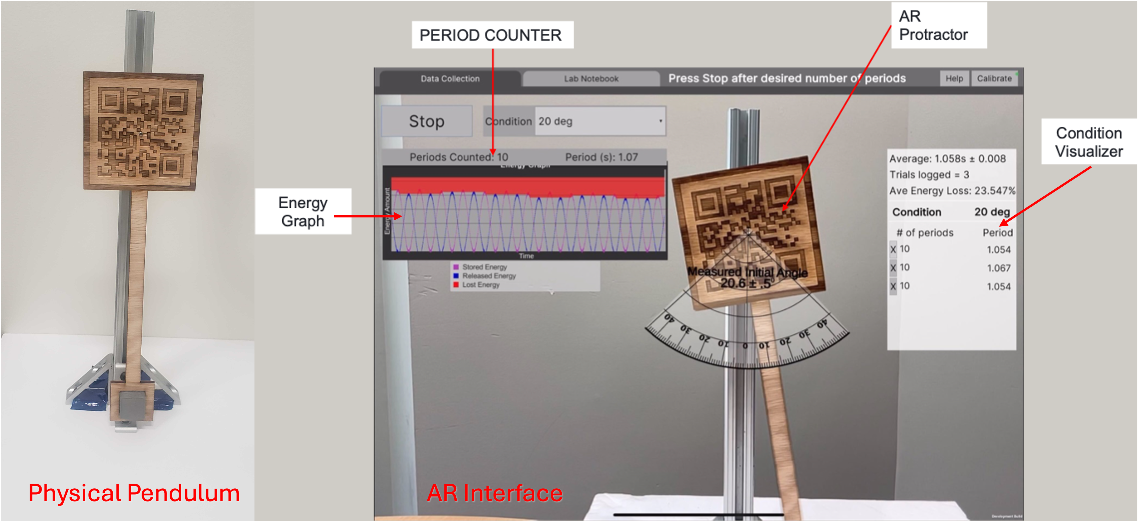 The AR system was developed as a mobile application layered over a real physical pendulum. It was designed to act as a cognitive aid by embedding measurement tools and visualizations directly in the experimental space:
